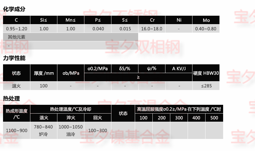 X105CrMo17板材可分别称为X105CrMo17不锈钢板、X105CrMo17钢板、X105CrMo17卷板、X105CrMo17开平板、X105CrMo17带钢、X105CrMo17冷轧板、X105CrMo17热轧板、X105CrMo17薄板、X105CrMo17中板、X105CrMo17厚板、X105CrMo17特厚板等。